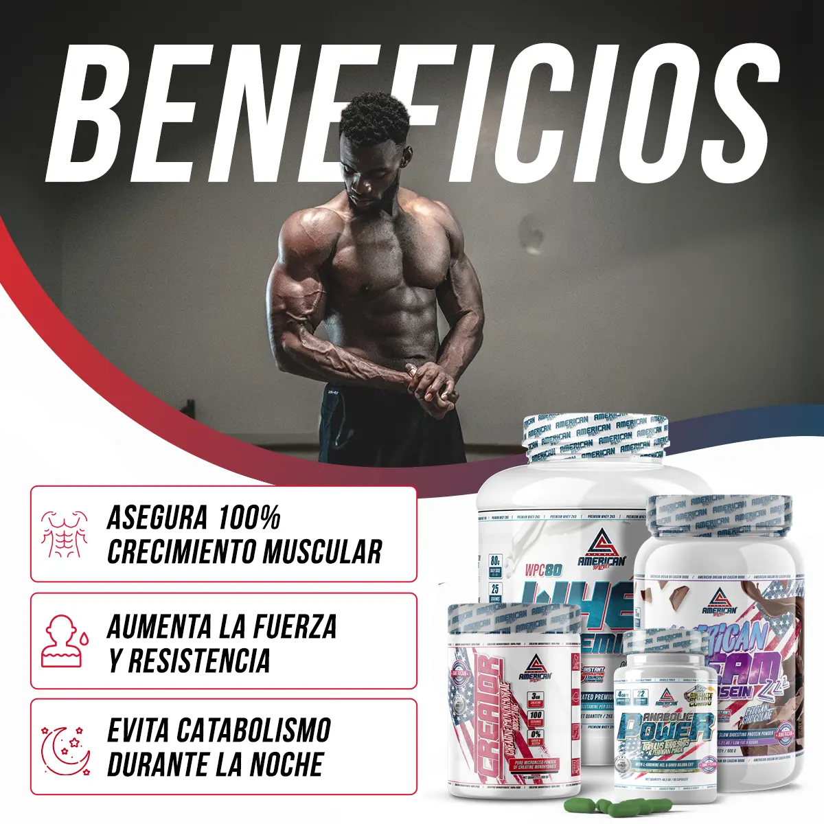 El PACK CRECIMIENTO MUSCULAR PROFESIONAL de American Suplement se compone de 4 productos principales y además incluye un shaker para facilitar la preparación.